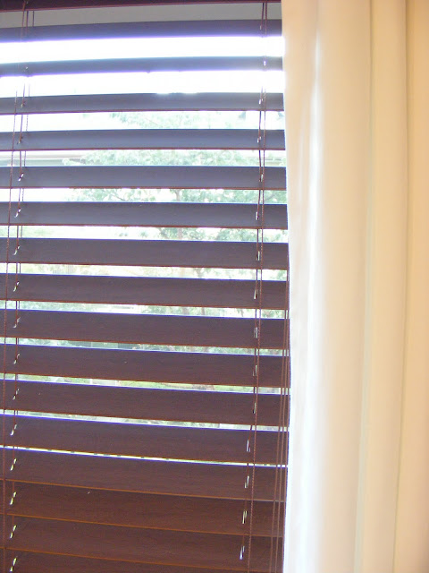 The blinds were a purchase that we weren't expecting to make. And as we found out a very expensive purchase we weren't expecting to make. We wrestled with many choices. We thought of the rustic bamboo blinds I love the look but try find bamboo blinds that fit glass sliders. Then we wrestled with the idea of having them non-functional and just for show, but in my head the old shaker saying (I love shaker sayings) "Beauty rests on utility!" so that killed the bamboo blind idea. Then naturally we made the move to wood blinds (no tacky metal venetian blinds here). We went to home depot with no ready made blinds long enough to cover our glass sliders, we consulted the blind consultant. That was over as soon as it started, with a quote of $507 for just the glass sliders we thought blinds were out of the question.