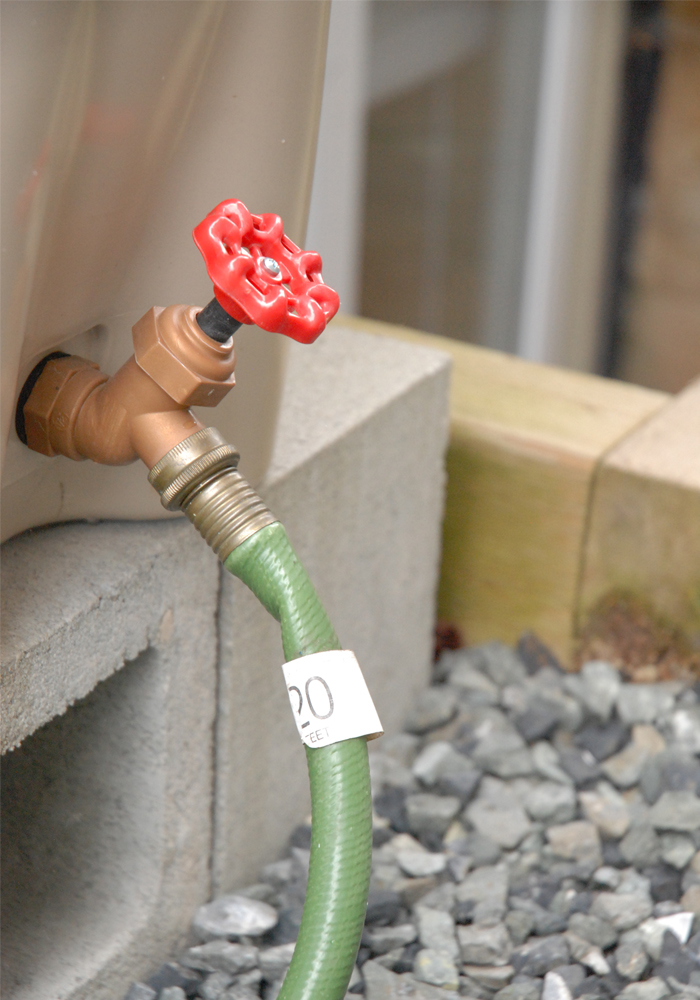 We used a regular hose to run from the barrel to the garden bed so we didn't waste water that would seep out over our gravel . . . gravel doesn't need to be watered, silly!